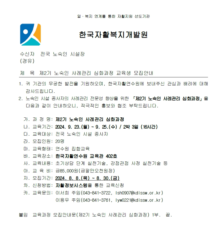 [교육홍보] 한국자활연수원 제2기 노숙인 사례관리 심화과정 교육생 모집안내 서울노숙인시설협회2024.08.08 10:48:55 조회651 제2기 노숙인 사례관리 심화과정 교육생 모집안내.pdf (132.35KB,149)(붙임) 교육과정 모집안내문(제2기 노숙인 사례관리 심화과정).pdf (172.44KB,173)제2기 노숙인 사례관리.jpg (350.15KB,117) 목록 로그인 번호 제목 등록일 조회 공지 [안내] 알기 쉬운 사회복지시설 운영 체크리스트(보건복지부) 2025-11-13 12 공지 [홍보] 시립은평의마을 '2025 후원자&자원봉사자 감사축제' 개최 안내 2025-11-07 53 공지 서울특별시립 비전트레이닝센터 재위탁 수탁법인 공개모집 안내 2025-10-17 188 공지 [안내] 2026년 확정된 최저임금 알림_고용노동부 2025-10-15 180 공지 [안내] 서울시립 다시서기종합지원센터 재위탁 수탁법인 공개 모집 안내 2025-10-13 161 공지 [신청안내] 서울시 노숙인시설 종사자를 위한 이랜드「리프레쉬 투어」지원사업 안내 2025-03-19 1957 공지 [사무처] 회원시설 종사자 조사(弔事) 지원 및 정년퇴임 공로패 증정 기준 안내 2021-05-10 6423 104 [교육신청안내] 노숙인시설 중간관리자 직무 역량 강화 교육 신청 안내 2025-10-01 253 103 [안내] 서울시사회복지협의회_제17회 2025 서울사회복지걷기대회 개최 및 참가 신청 안내 2025-09-26 275 102 [교육안내] 한국자활연수원 2025년 마지막 노숙인시설 대면 교육 안내 2025-09-26 134 101 [안내] 서울사회복지협의회_제26회 사회복지의 날 서울사회복지대회 행사 안내 2025-09-16 187 100 [안내] 서울시복지재단_2026년 서울형 사회복지시설(노숙인이용시설) 평가 전문위원 추가 모집 안내 2025-09-11 208 99 [홍보] 인정복지재단 만나샘 창립 20주년 기념 행사 안내 2025-09-10 185 98 [안내] 서울공동모금회_ ‘열매똑똑오피스’ 지원사업 안내 2025-09-04 279 97 [안내] 서울시복지재단_2026년 서울형 사회복지시설(노숙인이용시설) 평가 전문위원 모집 안내 2025-08-27 221 12345678 제목 내용 제목+내용 댓글 이름 닉네임 아이디 검색