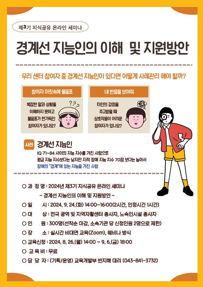 [교육안내] 한국자활연수원 제3기 지식공유 온라인 세미나 모집안내(경계선 지능인의 이해 및 지원방안) 서울노숙인시설협회2024.09.09 14:59:17 조회550 (포스터) 제3기 지식공유 온라인 세미나.png (133.13KB,136)(공문) 제3기 지식공유 온라인 세미나 모집안내 - 경계선 지능인의 이해 및 지원방안 -.pdf (1.2MB,194)(안내문) 제3기 지식공유 온라인 세미나 교육생 모집안내문.pdf (464.24KB,240) 목록 로그인 번호 제목 등록일 조회 공지 [안내] 알기 쉬운 사회복지시설 운영 체크리스트(보건복지부) 2025-11-13 413 공지 [안내] 2026년 확정된 최저임금 알림_고용노동부 2025-10-15 575 공지 [신청안내] 서울시 노숙인시설 종사자를 위한 이랜드「리프레쉬 투어」지원사업 안내 2025-03-19 2428 공지 [사무처] 회원시설 종사자 조사(弔事) 지원 및 정년퇴임 공로패 증정 기준 안내 2021-05-10 6693 112 제14대 서울노숙인시설협회 회장 선거 재공고 2026-01-05 83 111 [공고] 2025년 제18차 정기총회 개최 공고 2026-01-05 87 110 [안내] 열매에너지 ON 에너지효율개선 인프라 지원신청 안내(신청기간 연장) 2025-12-22 121 109 제14대 서울노숙인시설협회 회장 선거 재공고 2025-12-19 119 108 제14대 서울노숙인시설협회 회장 선거 공고 2025-12-04 158 107 [홍보] 시립은평의마을 '2025 후원자&자원봉사자 감사축제' 개최 안내 2025-11-07 297 106 서울특별시립 비전트레이닝센터 재위탁 수탁법인 공개모집 안내 2025-10-17 512 105 [안내] 서울시립 다시서기종합지원센터 재위탁 수탁법인 공개 모집 안내 2025-10-13 463 104 [교육신청안내] 노숙인시설 중간관리자 직무 역량 강화 교육 신청 안내 2025-10-01 435 103 [안내] 서울시사회복지협의회_제17회 2025 서울사회복지걷기대회 개최 및 참가 신청 안내 2025-09-26 455 102 [교육안내] 한국자활연수원 2025년 마지막 노숙인시설 대면 교육 안내 2025-09-26 303 12345678 제목 내용 제목+내용 댓글 이름 닉네임 아이디 검색