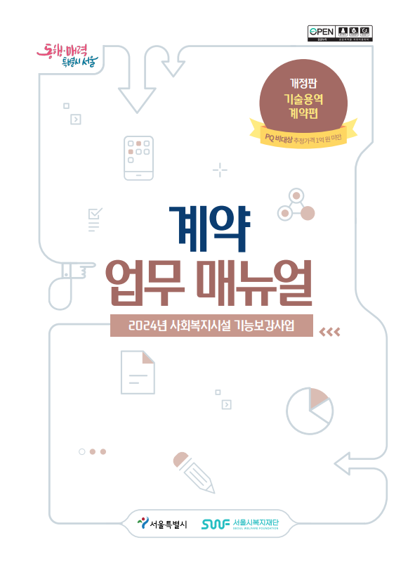[공유] 사회복지시설 기능보강사업 계약업무 매뉴얼 안내(물품계약편, 기술용역계약편) 관리자2025.02.11 13:53:56 조회797 서울복지재단에서 발행한 사회복지시설 기능보강사업 계약업무 매뉴얼 공유해드립니다. 회원시설에서는 업무에 참고하시기 바랍니다. *사회복지시설 기능보강사업 계약업무 매뉴얼 1. 2025년 물품계약편 2. 2024년 기술용역계약편 출처: 서울복지교육센터 > 자료공유 > 지침·매뉴얼 1- 2025년 물품계약편.Zip (7.71MB,137)2- 2024년 기술용역계약편.Zip (5.19MB,200)2025년_물품계약편_개정판_표지.png (120.19KB,81)계약업무매뉴얼_기술용역편.png (61.56KB,86) 목록 번호 제목 등록일 조회 공지 [공유] 알기 쉬운! 서울시 복지시설 공익제보 매뉴얼 2025-07-17 651 공지 [공유] 서울공동모금회, 2025년 사업수행안내자료 2025-06-04 1261 공지 [공유] 보건복지부, 2025년 사회복지시설 관리안내 2025-03-26 1312 공지 [공유] 2026년 사회복지시설 평가지표(노숙인생활시설) 2025-02-28 1417 공지 [공유] 보건복지부 2025년 노숙인 등의 복지사업안내(지침) 2025-01-21 1848 95 [공유] 보건복지부 노숙인등의 복지사업 안내(2023년) 2025-02-28 505 94 [공유] 보건복지부 노숙인등의 복지사업 안내(2022년) 2025-02-28 453 93 [공유] 보건복지부 노숙인등의 복지사업 안내(2019년, 2020년) 2025-02-28 408 92 [공유] 보건복지부 노숙인등의 복지사업 안내(2015년, 2017년, 2018년) 2025-02-28 440 91 [공유] 보건복지부 노숙인등의 복지사업 안내(2012년~2014년) 2025-02-28 459 90 [공유] 서울시사회복지협의회 민간자원매뉴얼_복지자원활용실무서 2025-02-14 934 89 [공유] 사회복지시설 기능보강사업 계약업무 매뉴얼 안내(새로운 공사계약편) 2025-02-11 1509 [공유] 사회복지시설 기능보강사업 계약업무 매뉴얼 안내(물품계약편, 기술용역계약편) 2025-02-11 798 87 [공유] 2024 사회복지시설 운영규정 표준안 개정판 2025-01-20 2776 86 [공유] 서울시 소규모 사회복지시설 종사자 폭력피해 예방 및 대응 매뉴얼 2025-01-20 799 1234567 제목 내용 제목+내용 댓글 이름 닉네임 아이디 검색