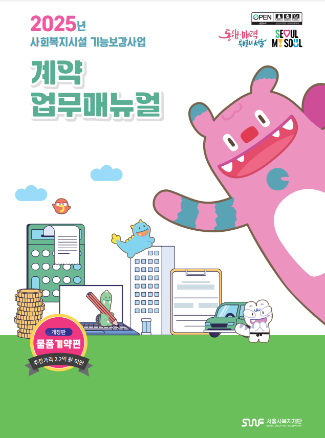 [공유] 사회복지시설 기능보강사업 계약업무 매뉴얼 안내(물품계약편, 기술용역계약편) 관리자2025.02.11 13:53:56 조회797 서울복지재단에서 발행한 사회복지시설 기능보강사업 계약업무 매뉴얼 공유해드립니다. 회원시설에서는 업무에 참고하시기 바랍니다. *사회복지시설 기능보강사업 계약업무 매뉴얼 1. 2025년 물품계약편 2. 2024년 기술용역계약편 출처: 서울복지교육센터 > 자료공유 > 지침·매뉴얼